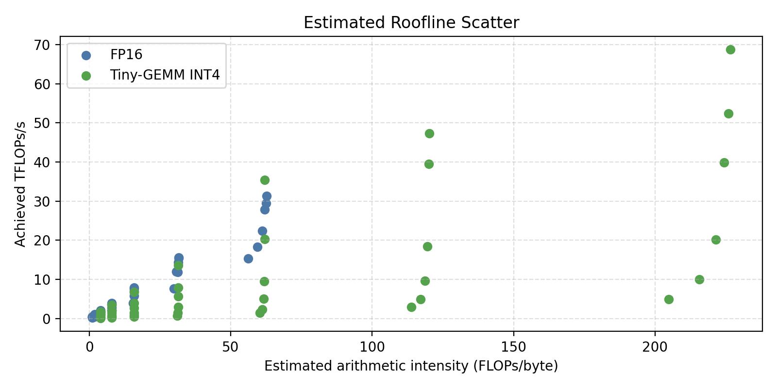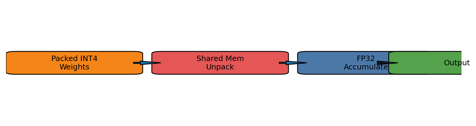 One important caveat: the kernel accumulates in FP32, not using INT4 tensor core MMA instructions. Exploiting Ampere/Hopper INT4 MMA is future work — the current bottleneck on decode shapes is memory, not compute, so the MMA throughput gap doesn't matter yet.