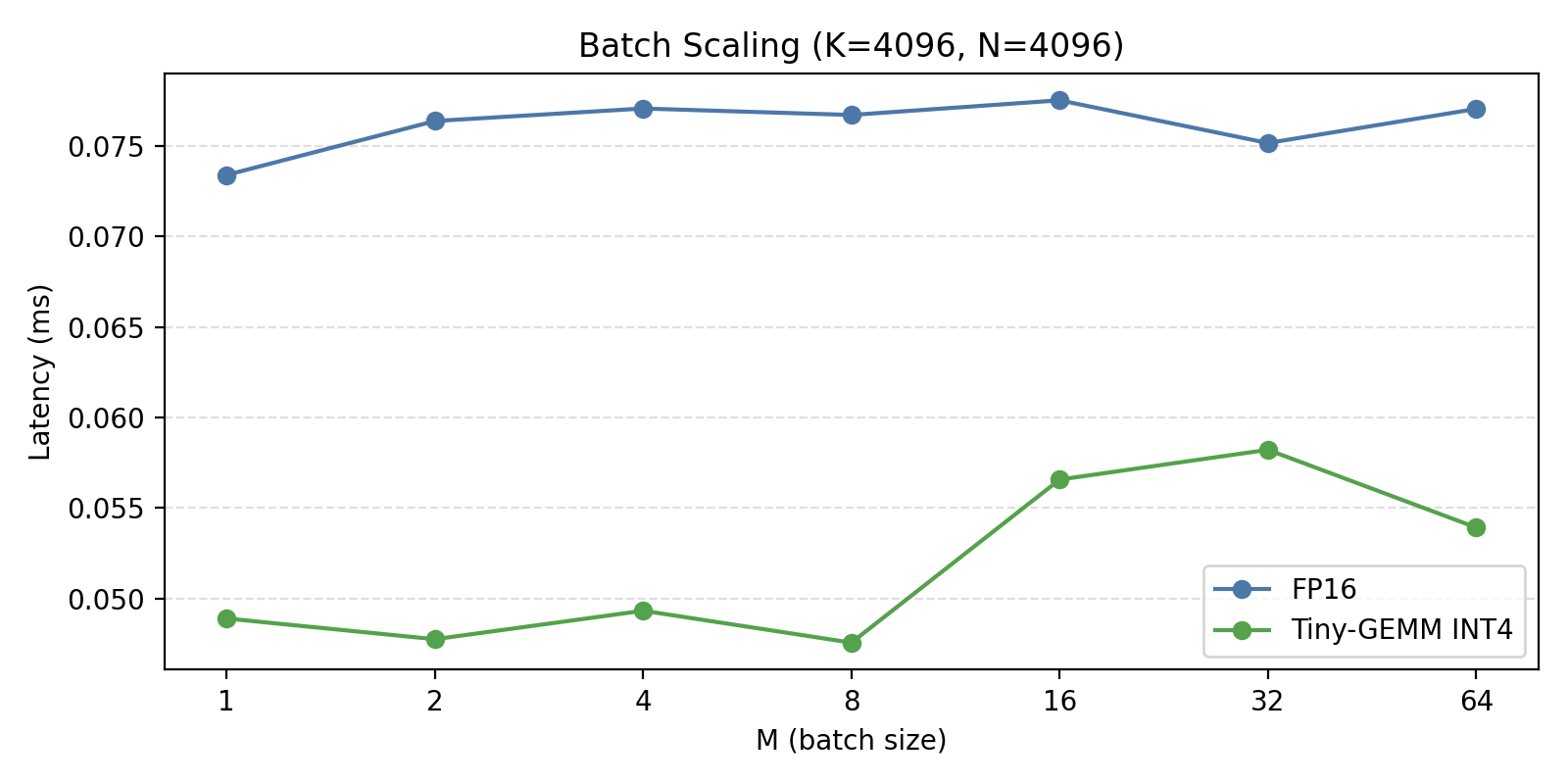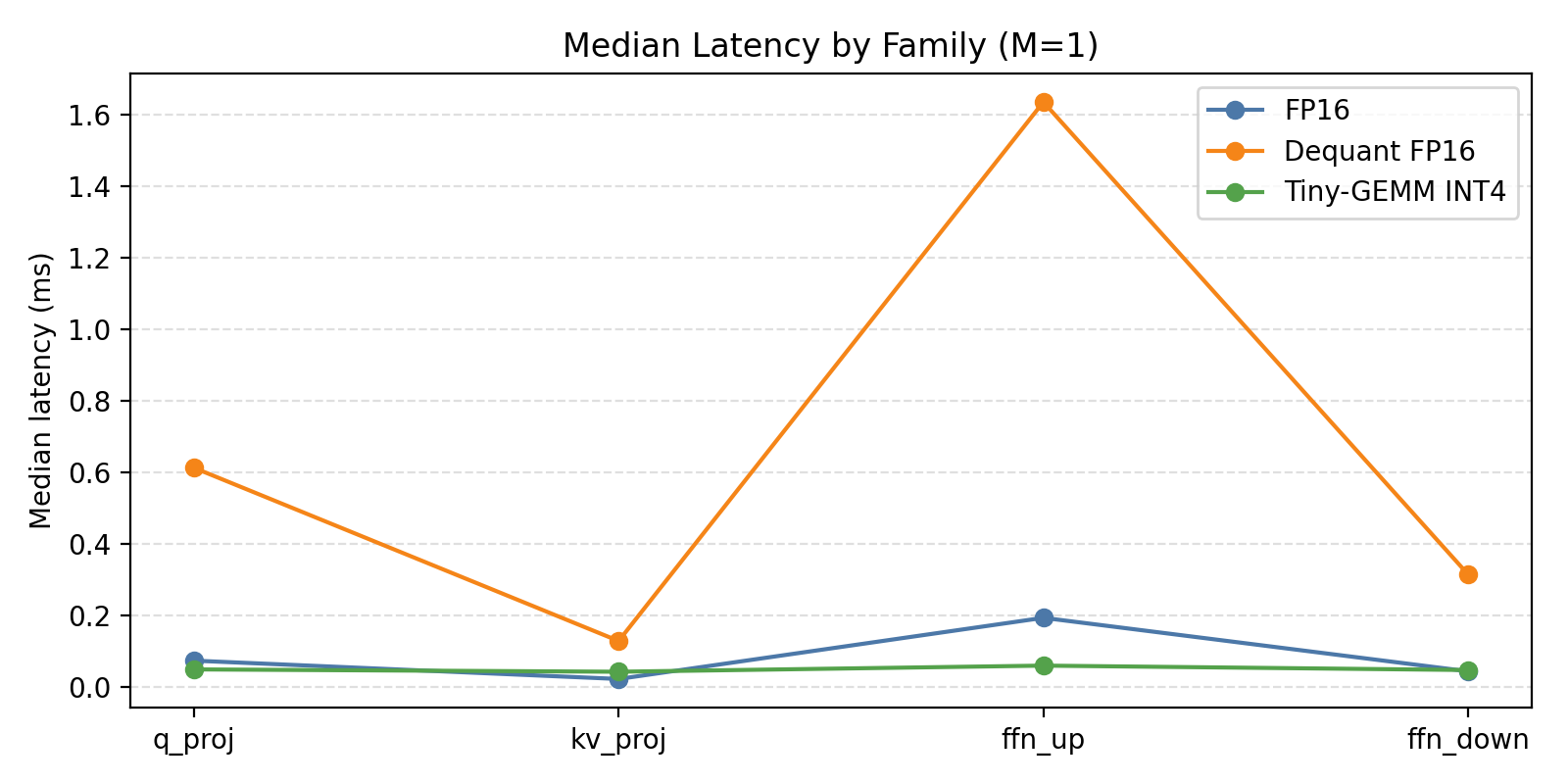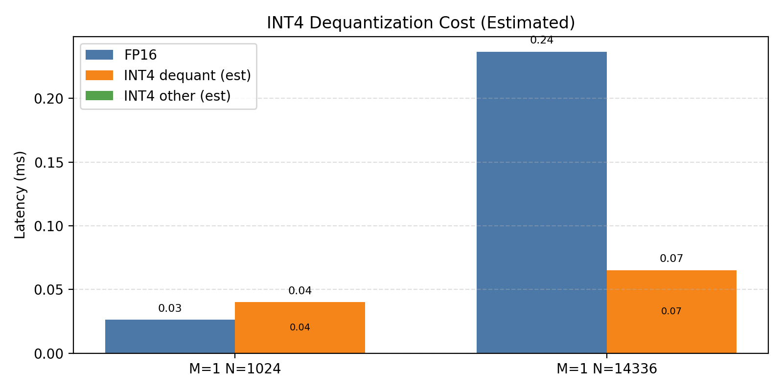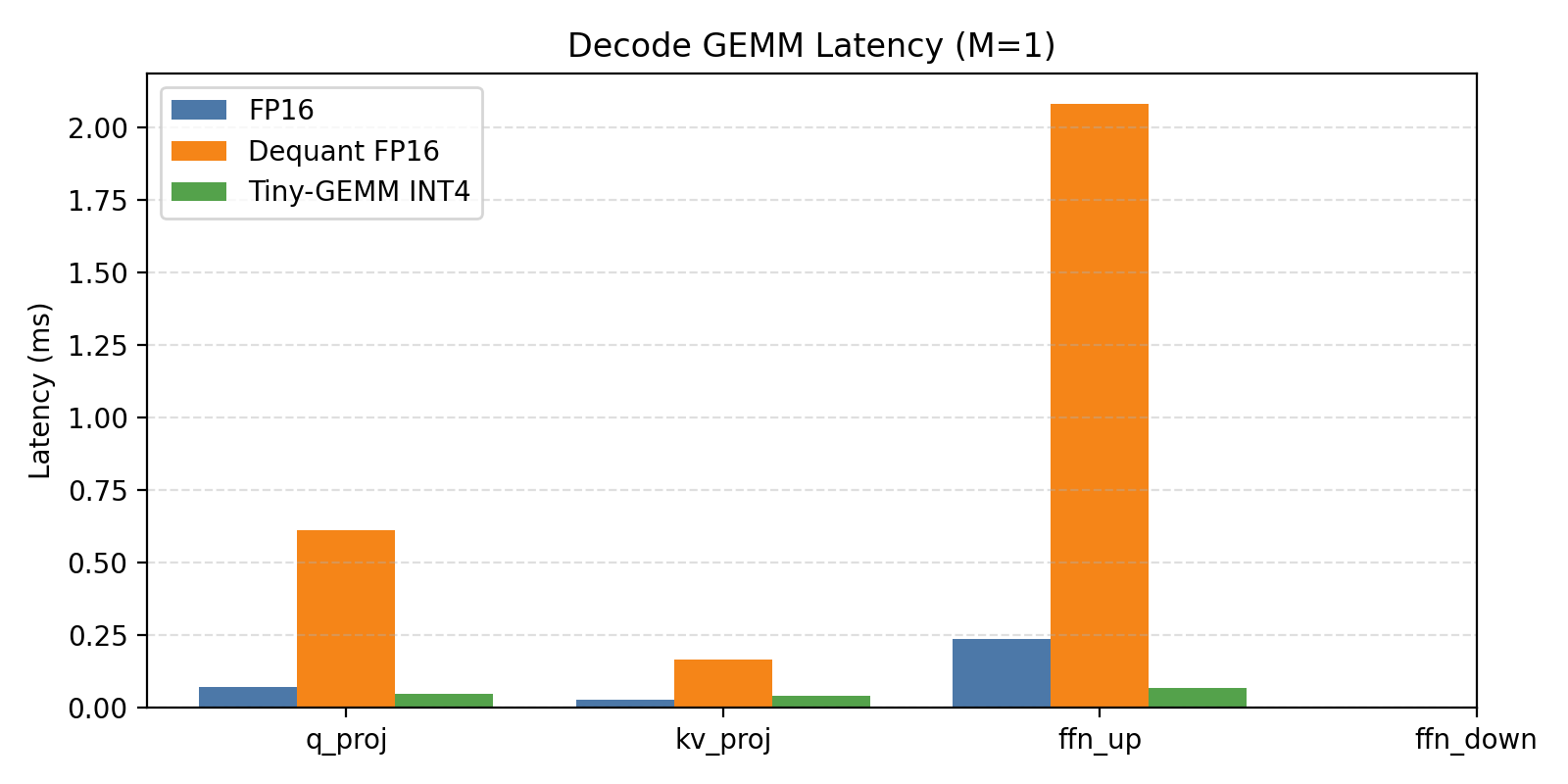 | KV proj (K=4096, N=1024) | 0.027 | 0.043 | 0.62× | Dequant overhead |