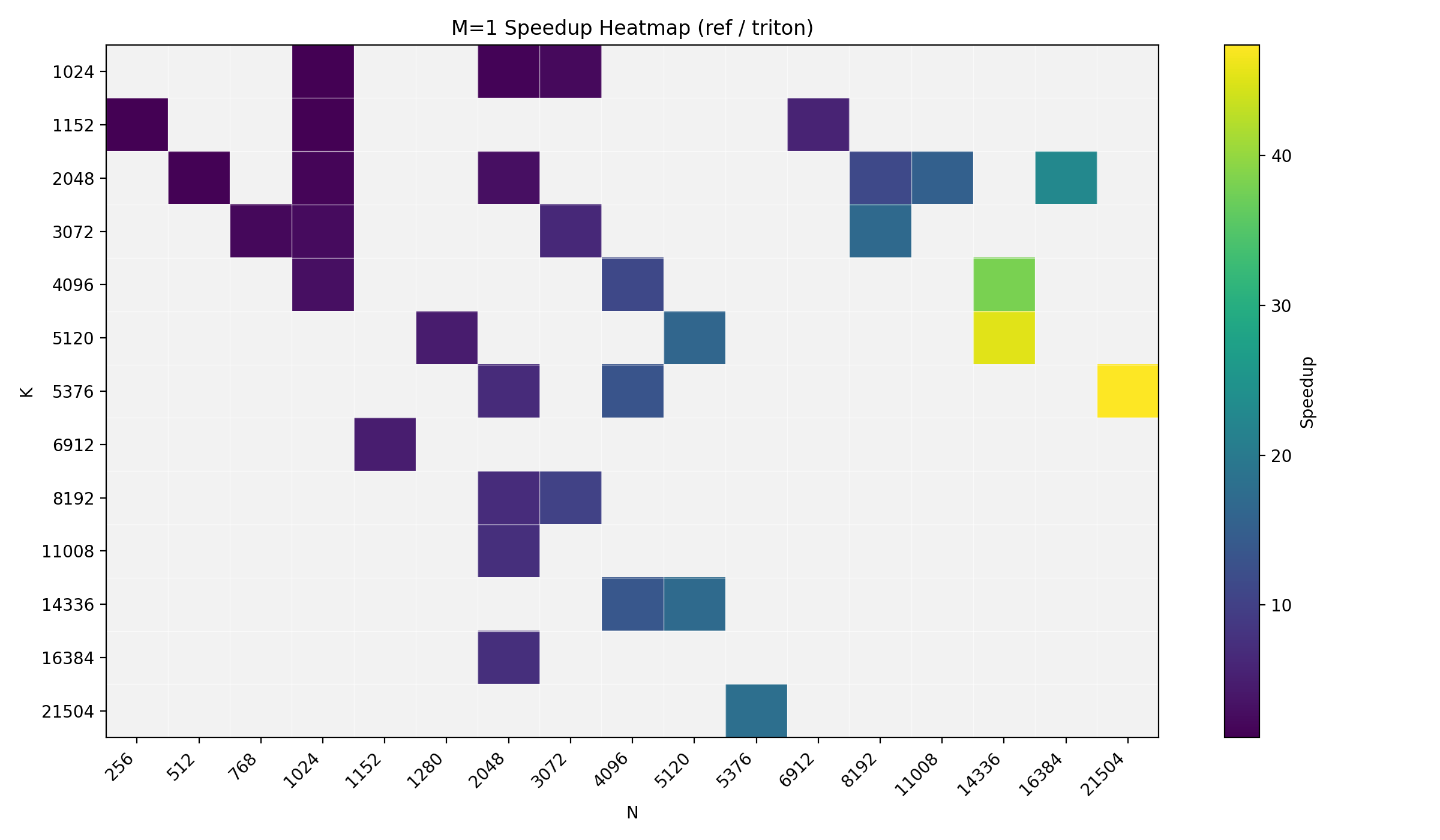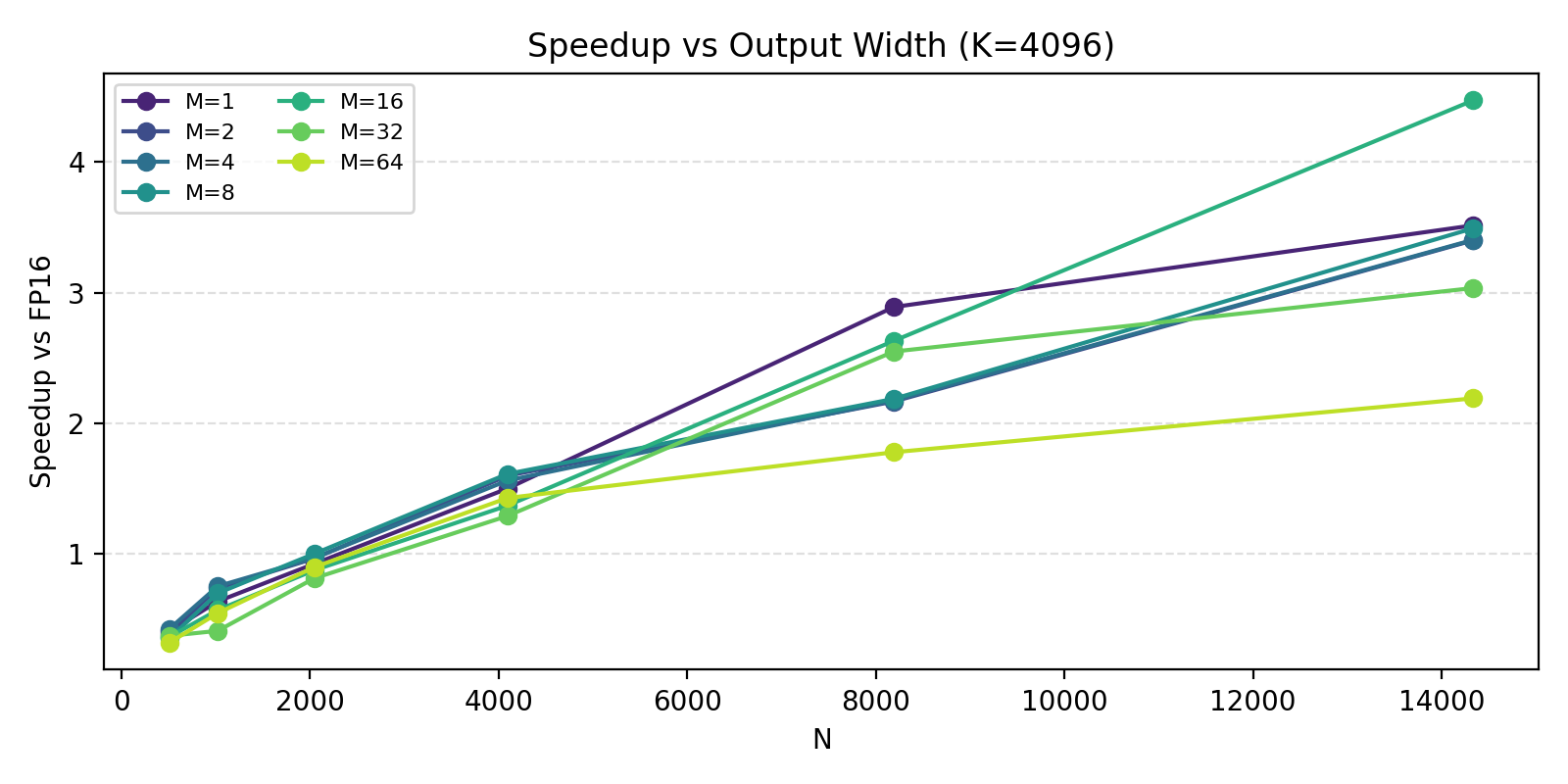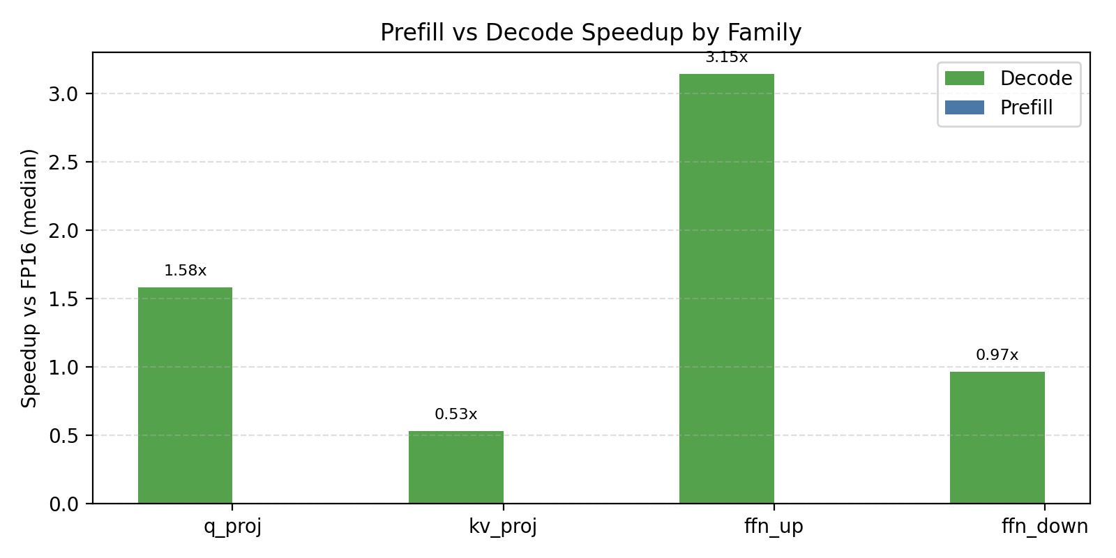 | FFN up (K=4096, N=14336) | 0.239 | 0.067 | 3.58× | Memory bandwidth |