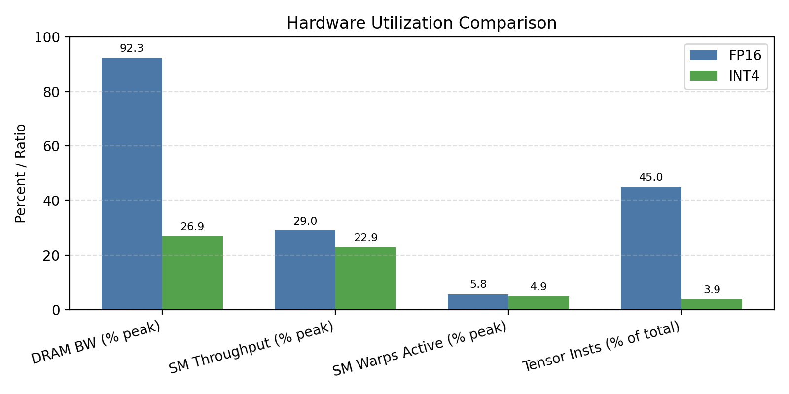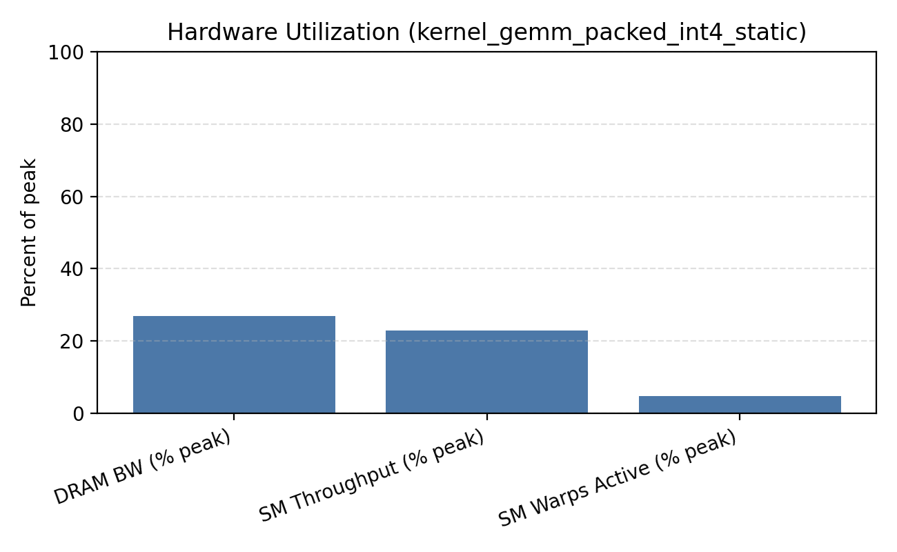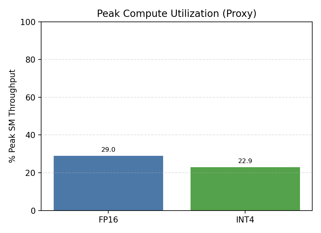 INT4 ends up at ~23% peak SM throughput vs ~32% for FP16. That's 28% less compute pressure — not because INT4 is more efficient, but because it's doing less useful work per cycle (more of the SM time goes to the unpack path). The memory traffic numbers confirm it: INT4 halves weight reads, consistently, across all shapes. The variable is whether you can convert that into latency savings.