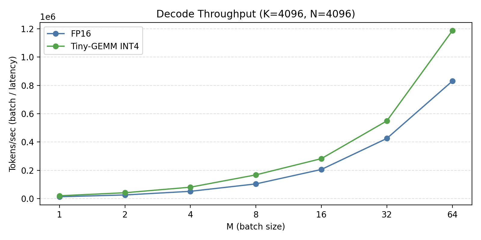 Decode latency and serving throughput are different objectives that sometimes point in opposite directions. Interactive serving wants minimum single-token latency (M=1). Batch serving wants maximum tokens/second (larger M). INT4 behaves differently in each.